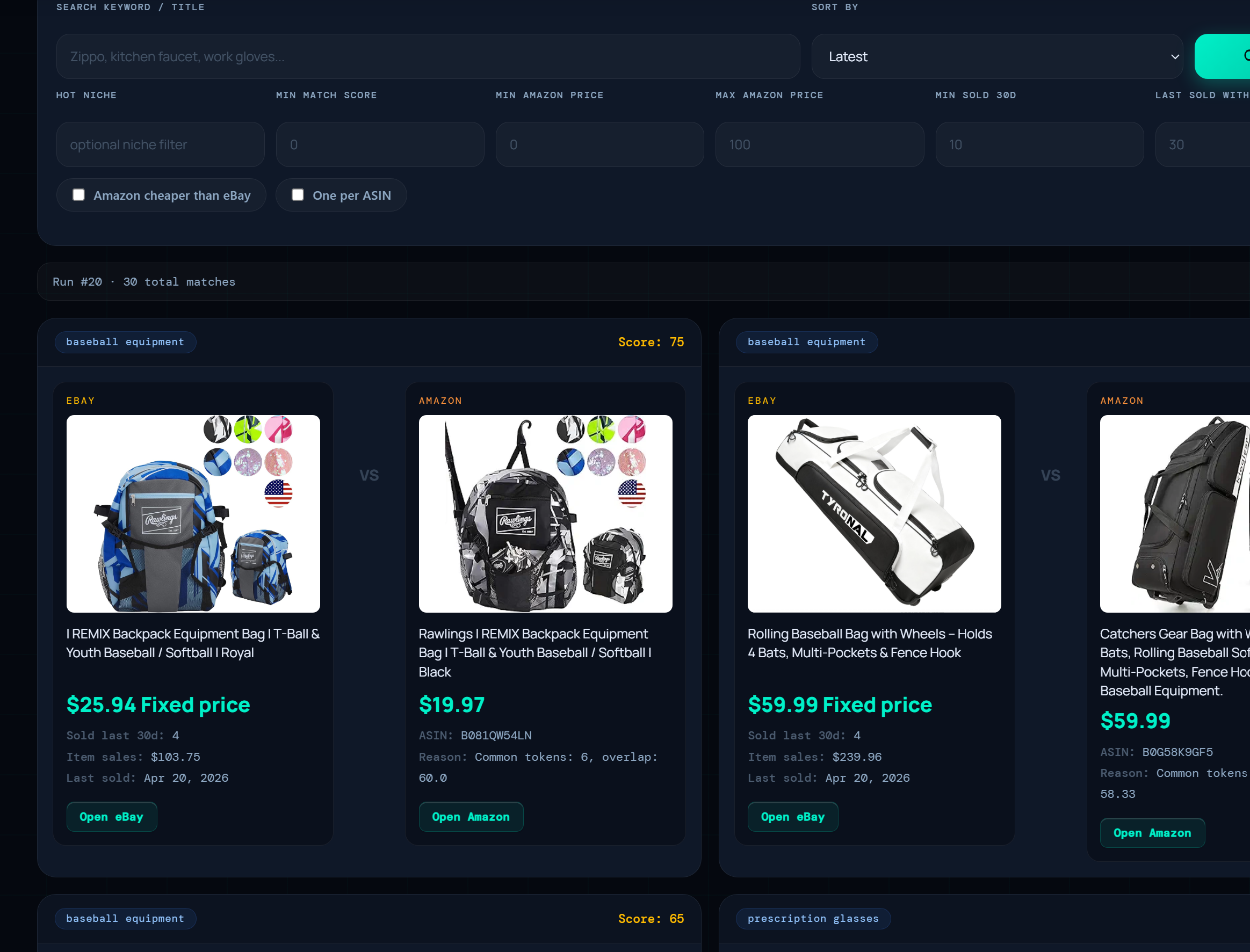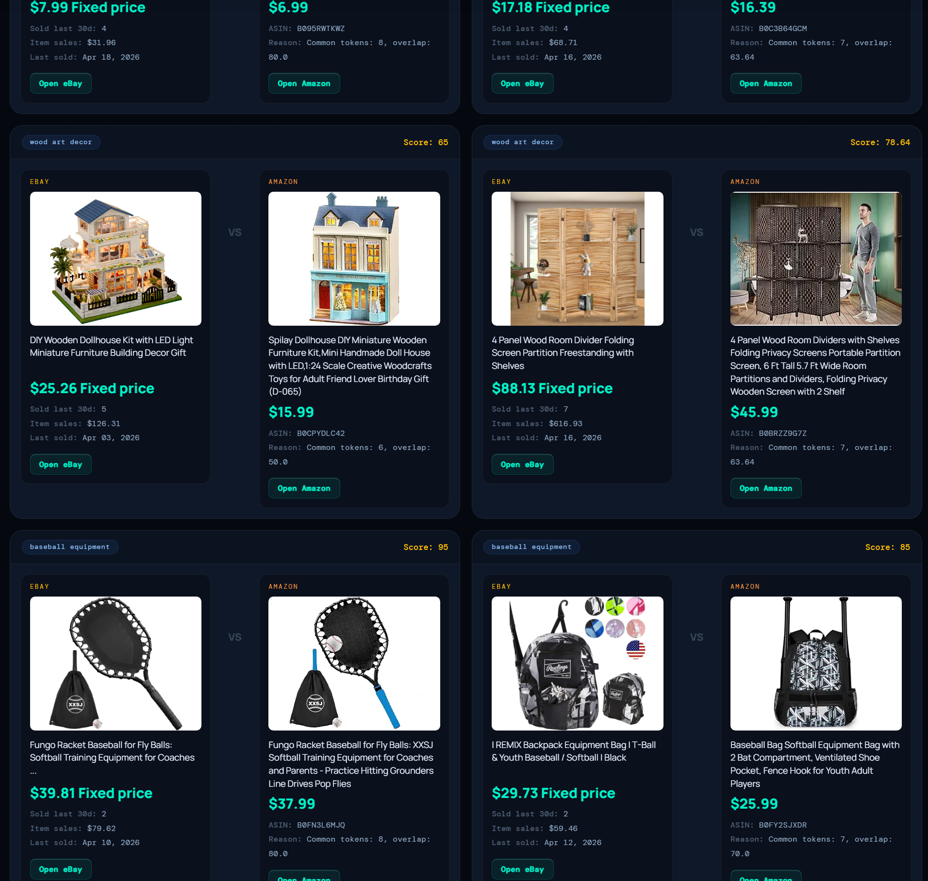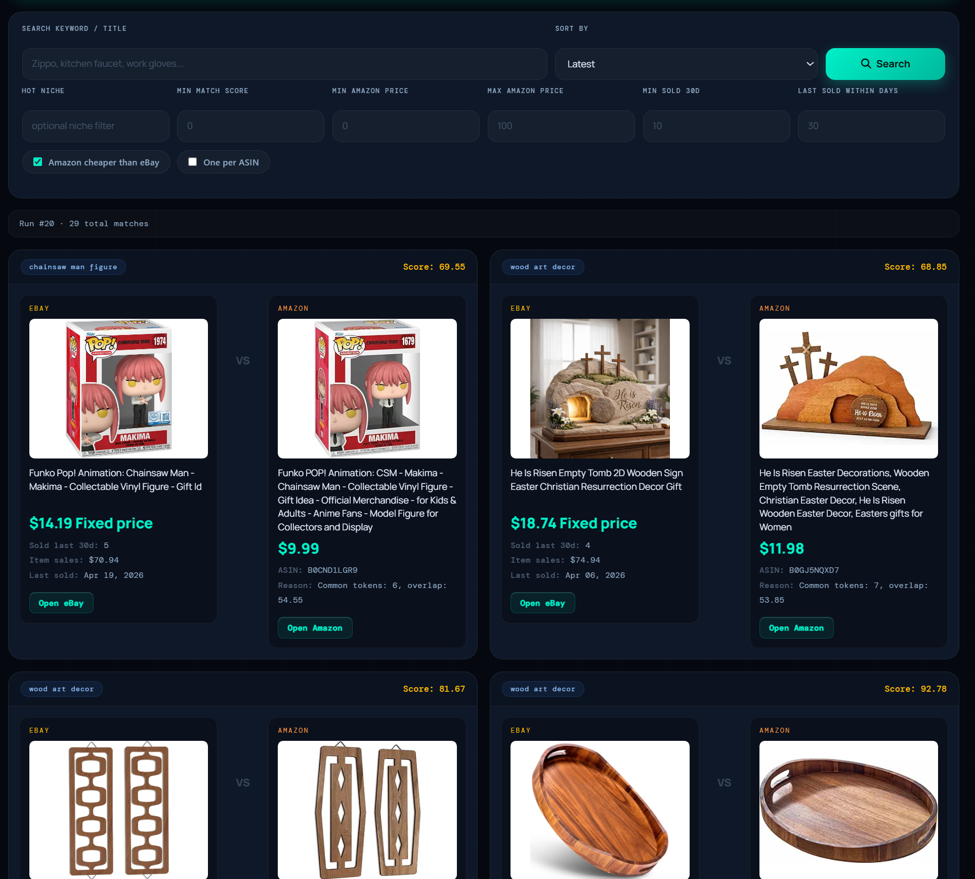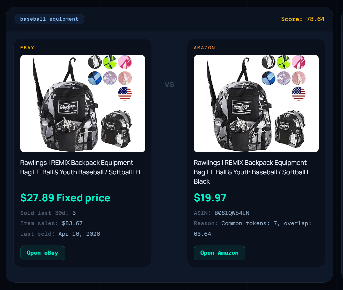 Download Chrome Extension — FreeEvery hot eBay product automatically matched to its Amazon equivalent. See the profit spread, sold history, match score, and supplier data — side by side in one card.